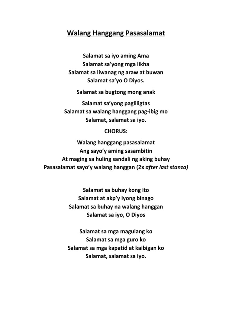 Salamat sa iyong pagliligtas. Intro Dm G C G Chorus F G Em Am Walang hanggang pasasalamat Dm G C C7 Ang sa Iyo aming sasambitin F E Am Maging sa huling sandali ng aming buhay Dm G C G Pasasalamat sa Iyo ay walang hanggan Verse 1 C Am7 Am Salamat sa Iyo aming Ama Dm G Salamat sa Ýong mga likha Em. C Am Dm G C.