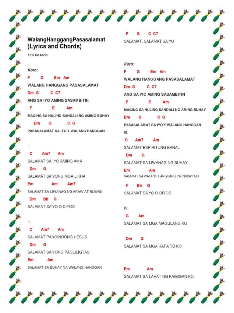 0 0 found this document not useful Mark this document as not useful. Create and get 5 IQ Intro Dm G C G Chorus F G Em Am Walang hanggang pasasalamat Dm G C C7 Ang sa Iyo aming sasambitin F E Am Maging sa huling sandali ng. Walang Hanggang Pasasalamat Verse 1 Salamat sa iyo aming Ama Salamat sayong mga likha Salamat sa liwanag ng araw at buwan Salamat sayo o diyos Verse 2 Salamat panginoong Hesus Salamat sayong pagliligtas Salamat sa buhay na walang hanggan Salamat salamat sayo Koro Walang hanggang pasasa-lamat Ang sa iyo aming sasambitin Maging sa huling.